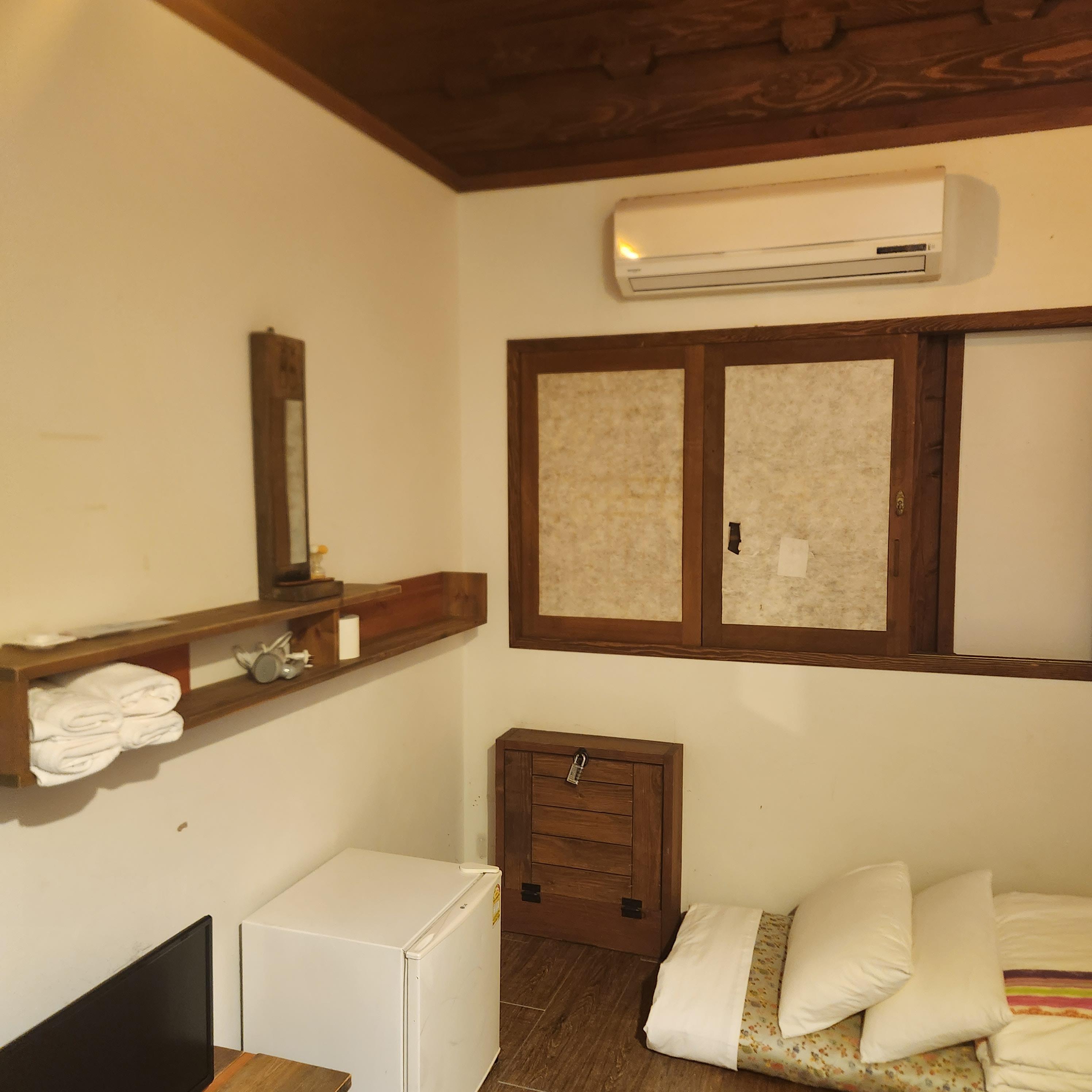 룸 크기가 크진 않아서 실망하게 될 수도 있지만 몇년전 친구랑 갔던 한옥숙소는 이 룸의 반 정도 크기였어서 나는 룸 크기는 당연히 작을 거라고 예상했었다. 오히려 아늑해서 좋기도 했다. 베개와 침구가 다 커버로 덮여있고 깨끗해서 만족스러웠다.